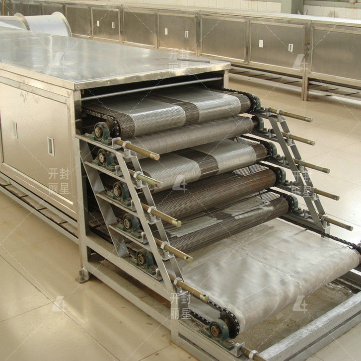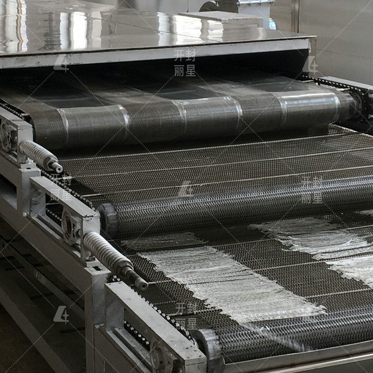 自動(dòng)化水晶粉皮生產(chǎn)線工藝流程:預(yù)熱→原料攪拌→真空上料→鋪漿成型→蒸箱蒸熟→水冷卻→脫離→烘箱烘干→橫切→二次烘干→排潮處理→成品出機(jī)。